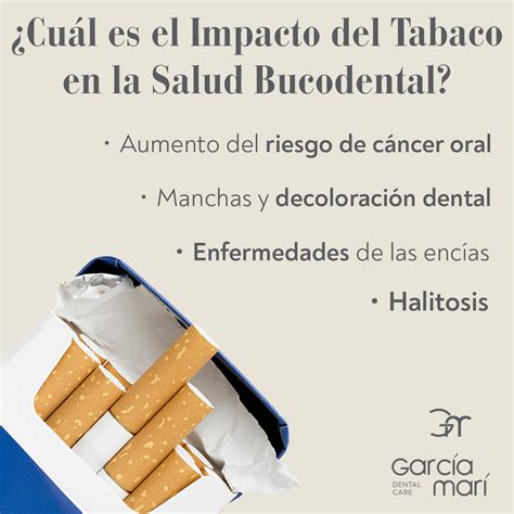 - Evitar el tabaco: Si fumas o masticas tabaco, considera seriamente dejar este hábito. Además de los riesgos enormes para tu salud general (cáncer, problemas pulmonares, cardiovasculares, etc.), el tabaco arruina la salud bucal: no solo mancha los dientes de negro, sino que aumenta el riesgo de enfermedad periodontal (de las encías) y cáncer oral.