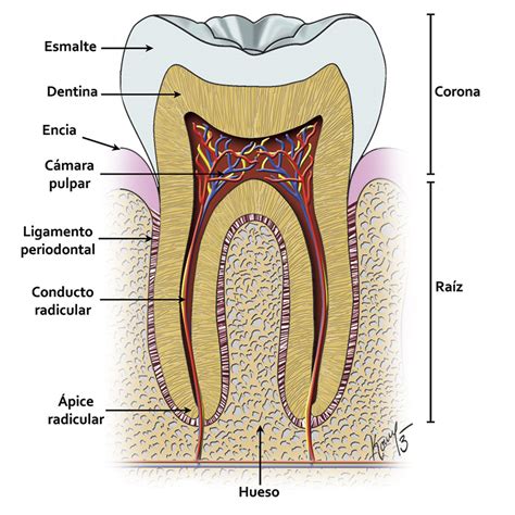 Anatomía del diente mostrando la pulpa dental y los conductos radiculares