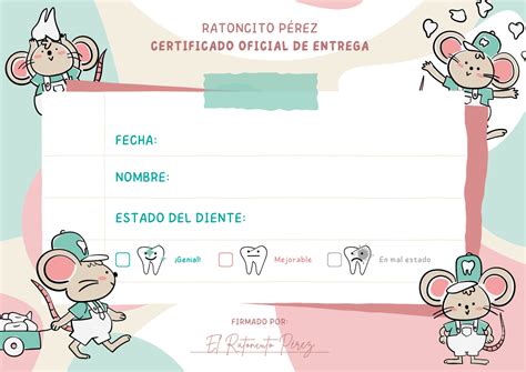 Ahora, puedes imprimir un certificado dental del Ratón Pérez. Es una herramienta creativa que puedes utilizar para fomentar hábitos de cuidado dental en tus hijos. La idea es que cuando un niño pierde un diente y lo coloca debajo de la almohada para que el Ratón Pérez lo recoja, este deja un certificado dental en lugar del diente.