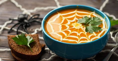 La crema de calabaza es una de las recetas protagonistas de Halloween. Para ambientarla para la ocasión, puedes decorarla dibujando unas telarañas de nata y queso crema. Con unos pequeños detalles terroríficos podrás añadirla sin problema a las comidas de Halloween.