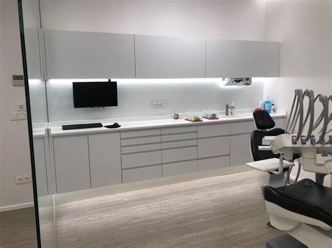 - Muebles de almacenamiento y esterilización: Dentro de los gabinetes dentales, los muebles (encimeras, armarios, cajoneras) conviene que sean de superficies lisas, sin tiradores muy sobresalientes.