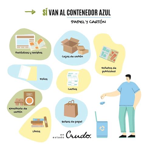 | Papel y Cartón | Azul | Periódicos, revistas, folletos, cajas de cartón | Servilletas de papel de cocina, papeles con restos de comida |