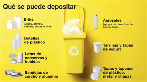 | Plásticos y Envases | Amarillo | Botellas de bebidas, botes de plásticos de alimentos, latas de refrescos | Juguetes rotos, cepillos de dientes, paraguas |