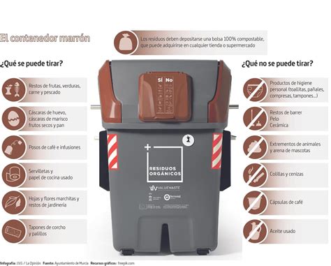 | Desechos Orgánicos | Marrón | Restos de comida, posos de café, cáscaras de huevo | Pañales, compresas, colillas |