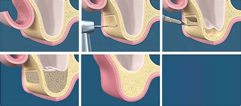 - Relleno con el material de injerto óseo: al elevar la membrana, se crea un espacio debajo de ella que posteriormente se rellena con un material de injerto óseo.