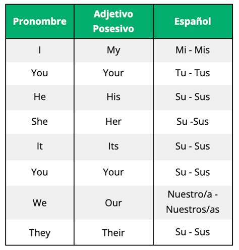 Los adjetivos posesivos indican a quién pertenece la propiedad sobre una cosa. En inglés, son menos numerosos que en español, ya que no se diferencian en singular o plural. Presta atención cuando se refiere a la tercera persona singular y plural, ya que en español se usa “su” o “sus” en todos los casos, mientras que en inglés varían según la persona.