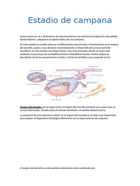 El estadio de campana se caracteriza por la diferenciación de las células que van a dar lugar al esmalte y la dentina. Aproximadamente en la semana 10 de vida intrauterina encontramos los dientes deciduos en fase de campana y los dientes permanentes en fase de brote.