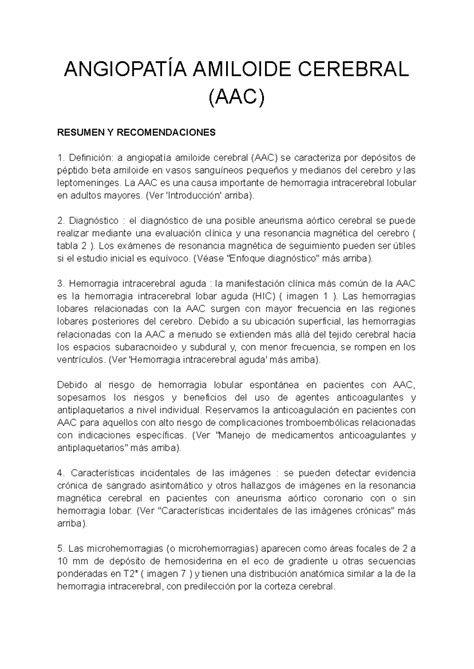 Es una enfermedad vascular que se asocia a demencia en más de la mitad de los casos. Es una causa frecuente de hemorragia cerebral primaria, lobar y en ocasiones múltiple, en pacientes de más de 60 años. Debe sospecharse en pacientes normotensos que inician un proceso de deterioro intelectual y súbitamente presentan uno o más hematomas intracerebrales.