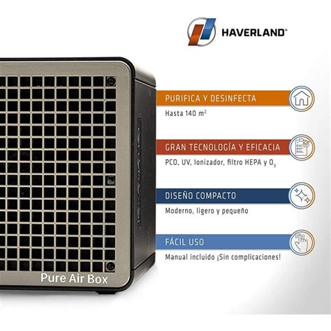 El purificador de aire de Haverland ioniza, desinfecta y oxigena el aire. El Pure Air Box by Haverland asegura eliminar patógenos (bacterias, virus), polvo en el hogar, alérgenos (pelo de mascotas, polen) moho (hongos, esporas), además de otros microorganismos, COVs (Componentes Orgánicos Volátiles) e impurezas en el aire que a simple vista son inapreciables.