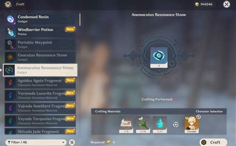 La roca de resonancia Anemóculus, es un objeto que se puede elaborar mediante la alquimia, pero debes tener desbloqueado el nivel 2 de reputación en las localidades de Liyue y Mondstadt para poder recibir las instrucciones de su elaboración. A partir de allí estarás calificado para crear este ítem teniendo los ingredientes necesarios para esta tarea. En este caso debes contar con Cecilia x5, 500 de mora, un trozo de cristal, 5 semillas de diente de león, y dirigirte a un banco de elaboración.