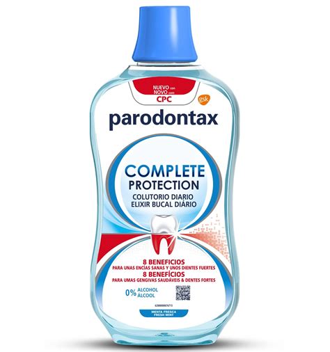 El enjuague bucal diario Parodontax Complete Protection, con tecnología CPC, tiene 8 beneficios que brindan una protección completa para encías sanas y dientes fuertes*. Ayuda a mantener las encías sanas, actúa sobre la placa bacteriana y limpia la línea de las encías.