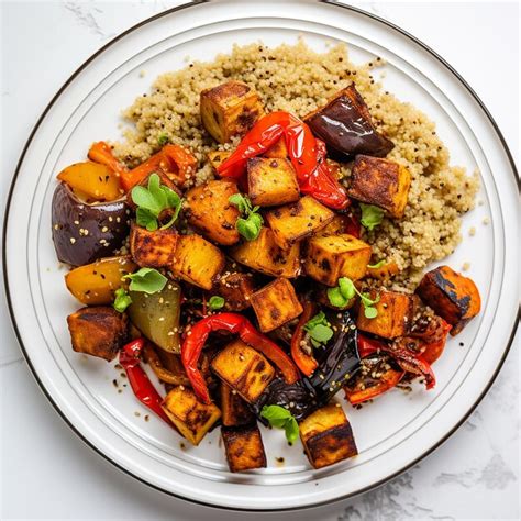 - Ensalada saludable de quinoa con verduras asadas y tofu