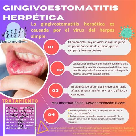 En los labios, alrededor de la boca, en la mucosa bucal y gingival y también en la orofaringe aparecen numerosas vesículas que se transforman en erosiones extensas y úlceras superficiales asociadas a dolor intenso al comer y al hablar. Estas vesículas pueden aparecer en la mucosa queratinizada y también en la mucosa no queratinizada. La enfermedad tiene una duración aproximada de 2 a 3 semanas, lo que en determinados casos provoca una pérdida de peso importante, dado que durante este período los pacientes a menudo sólo pueden ingerir líquidos. El tratamiento es sintomático. Además de analgésicos sistémicos y de un colutorio bucal con acción desinfectante y acción anestésica local, a menudo se prescribe un antibiótico si existe una sobreinfección. En pacientes inmunodeprimidos está indicado un tratamiento antiviral sistémico con aciclovir. Por lo demás, se trata de una enfermedad autolimitada.