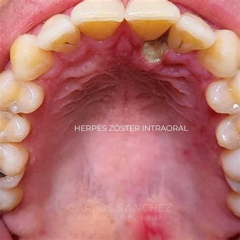 Las lesiones intraorales aparecen sobre todo en pacientes inmunodeprimidos y se localizan habitualmente en las encías y también en el paladar duro. Los pródromos de las lesiones clínicas visibles consisten en prurito, hormigueo y sensación de quemazón. A continuación se desarrollan pápulas rojizas agrupadas que se transforman en vesículas con un borde rojizo y que, por último, se ulceran y cicatrizan formando una costra.