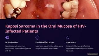 Se identifica el VHH 8 en todas las variantes del sarcoma de Kaposi, es decir, en la forma clásica, la forma africana endémica, la asociada a la inmunosupresión iatrogénica y la forma epidémica asociada al VIH. El sarcoma de Kaposi es una neoplasia vascular. Las lesiones orales del sarcoma de Kaposi se manifiestan principalmente en el paladar, las encías y la lengua. Aparecen inicialmente como manchas rojizas a violeta azuladas que se pueden transformar en placas, nódulos y tumores a medida que evoluciona la enfermedad. Las lesiones orales son asintomáticas en la mayoría de los casos, pero se pueden manifestar clínicamente por hemorragias, dolor y úlceras durante el curso evolutivo de la enfermedad.