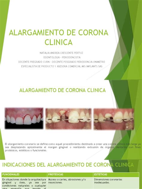 Es un procedimiento de cirugía periodontal que puede realizarse tanto para tratar una caries o poner una corona o una carilla como para corregir estéticamente una sonrisa gingival. El procedimiento de alargamiento coronario implica una microcirugía periodontal para practicar la eliminación selectiva del tejido gingival (encías) y/o del hueso alrededor del diente para exponer una mayor cantidad de la corona dental. La cirugía se aborda con anestesia local para asegurar la comodidad del paciente durante el proceso. El alargamiento coronario es un procedimiento seguro y efectivo cuando es realizado por un periodoncista formado y experimentado.