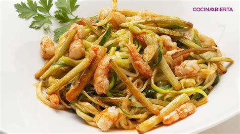 - Con gambas: Saltea las gambas con ajo y chalotas, agrega vino blanco y nata, y mezcla con los espaguetis de calabacín.