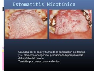 La estomatitis nicotínica es una lesión potencialmente maligna de la mucosa oral, comúnmente asociada con el uso crónico de tabaco, especialmente en fumadores de pipa, cigarrillos y otros productos de tabaco. Esta condición se caracteriza por alteraciones inflamatorias típicas localizadas en el paladar de los fumadores.