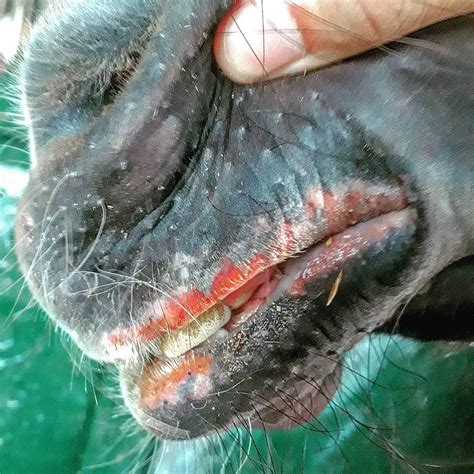 Lesiones de estomatitis vesicular en la lengua de un caballo.