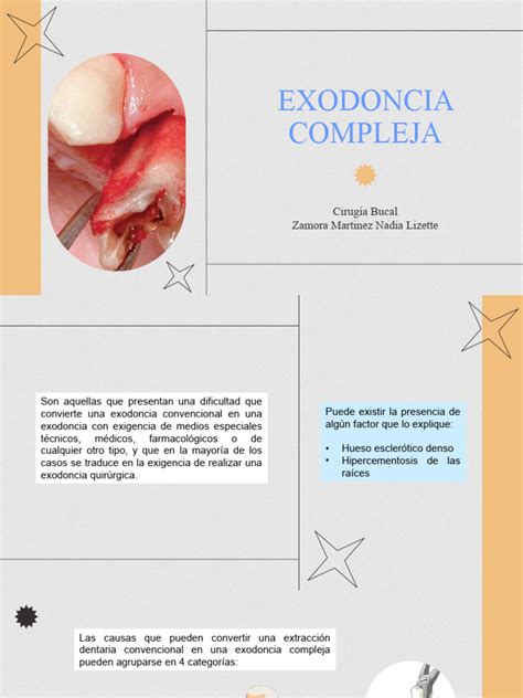 La exodoncia compleja es aquella en la que se considera necesario intervenir quirúrgicamente al paciente, una vez observadas ciertas dificultades para realizar una exodoncia simple. Otra forma de llamar a la exodoncia compleja, haciendo referencia a que se trata de un proceso con más fases y más delicado.