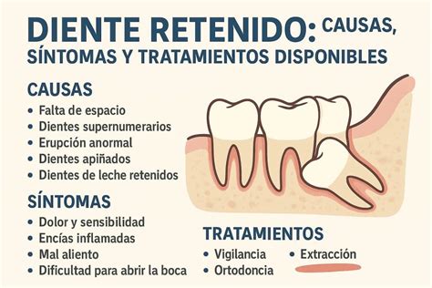 Las causas de un diente retenido pueden variar y están relacionadas con factores genéticos, anatómicos o de desarrollo. Una de las razones más frecuentes para que un diente se retenga es la falta de espacio adecuado en la boca para que el diente erupcione correctamente. Algunos dientes pueden desarrollarse en posiciones anómalas, como giros o inclinaciones, lo que dificulta su erupción.