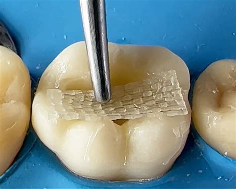 - La fibra Ribbond se impregnó con resina adhesiva Tenure S (Den-Mat, Santa Maria, CA) y se secó con la servilleta del paciente para eliminar el exceso de resina.