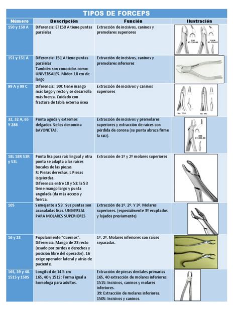 Dependiendo del diente que necesite ser extraído, se utilizan diferentes fórceps. Los más comunes se dividen en fórceps para incisivos, caninos, y molares, ya que cada tipo de diente tiene una forma y ubicación particular en la boca.