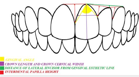 El espacio interdental incisal es más pequeño y anguloso entre los incisivos centrales, creando un triángulo isósceles con un ángulo vertical apical agudo. El espacio interdental incisal entre el incisivo central y el lateral es mayor y menos agudo. Unos incisivos centrales relativamente simétricos y unos incisivos laterales relativamente asimétricos favorecen el aspecto estético de la sonrisa. La forma del triángulo entre el incisivo central y lateral debería variar a ambos lados.