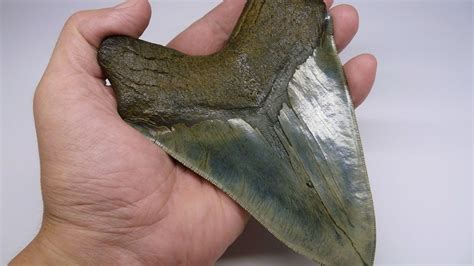 Diente de megalodón fósil cubierto con una capa de ferromanganeso.
