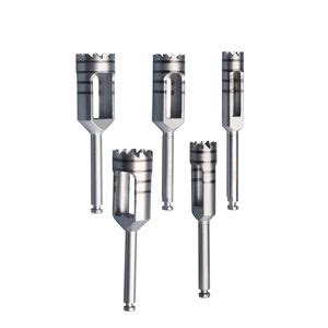 - Recolección de hueso: Las fresas trefinas se pueden utilizar para recolección de hueso y extracción de implantes fracturados entre otras finalidades. Las aberturas laterales facilitan la retirada de la recolección de hueso.
