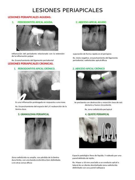 Las lesiones periapicales, resultado de la necrosis de la pulpa dental, son las patologías que más frecuentemente ocurren encontradas en el hueso alveolar. El tratamiento consiste en la eliminación de los agentes infecciosos mediante el tratamiento del canal radicular, permitiendo la cicatrización de la lesión. Un estudio histológico puede ser usado para medir los síntomas clínicos y los signos radiográficos contra la naturaleza de las posibles alteraciones del tejido perirradicular; y confirmar el diagnóstico de periodontitis periapical y distinguirla de una lesión no inflamatoria.