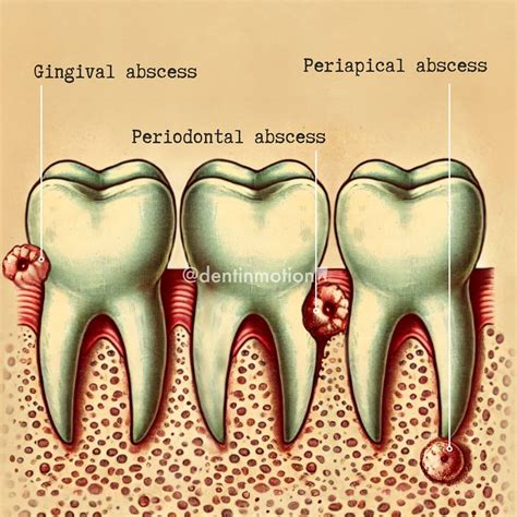 - Absceso periodontal: se forma en los tejidos de soporte del diente, como el hueso o el ligamento periodontal.