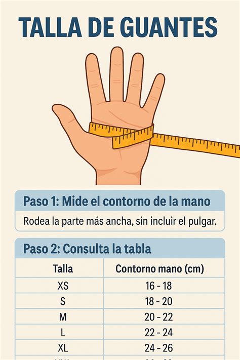 Hoy en día existe una amplia gama de tallas de guantes que van desde la XS a la XXL. Una de las maneras más comunes para saber cuál es tu talla, es medir el contorno de tu mano. Para ello, tienes que pasar una cinta métrica flexible alrededor del punto más ancho de tu mano (de los nudillos). En función de la medida que salga, puedes ver en la siguiente tabla cuál es tu talla ideal.