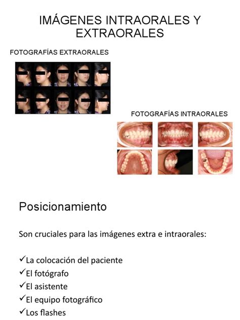 Fotografías extraorales e intraorales para analizar la simetría facial y malposiciones dentarias, entre otras.