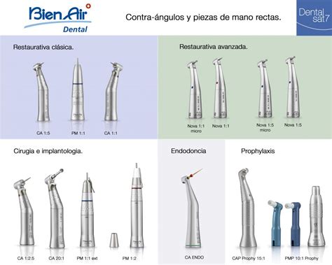 Instrumentos rotatorios: Son equipos muy precisos que se utilizan para restaurar las piezas dentales Entre ellos están las turbinas, que cuentan con un sistema de compresión de aire que ofrece una mayor velocidad de rotación y se usa para trabajar en los tejidos duros de los dientes o en las prótesis. Entre los instrumentos rotatorios también está el contra ángulo con menor potencia que las turbinas, y que se utiliza para eliminar caries, pulir superficies y vaciar cavidades; y los micromotores que dan velocidad de rotación y torque distinto al de la herramienta original.