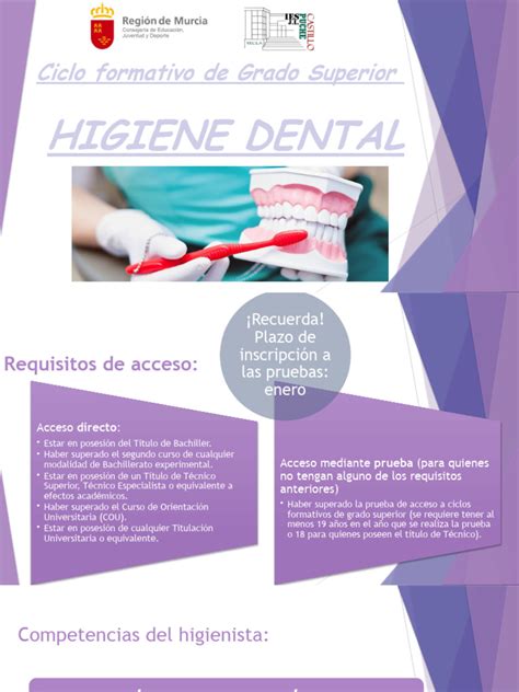 Respecto a los requisitos académicos, para acceder al Grado Superior de Higiene Bucodental necesitarás tener el título de Bachillerato, otro título de Técnico Superior o bien un título de Técnico (Grado Medio). Si tienes más de 19 años y no reúnes ninguno de los requisitos anteriores, también se permite acceder con las pruebas de acceso a ciclos de Grado Superior.