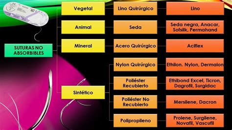 Existen varios tipos de suturas en odontología, clasificados según su capacidad de absorción y su origen: