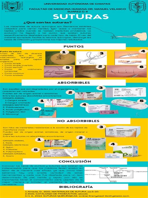 - Suturas sintéticas: Poliéster, polipropileno, poliglactina, etc.