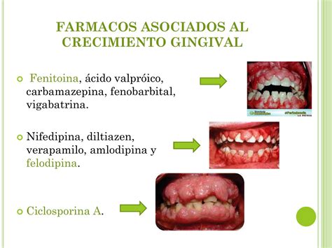- Anticonvulsivos: Fármacos anticonvulsivantes, particularmente la fenitoína (Dilantín), pueden provocar hiperplasia gingival en aproximadamente 50% de los pacientes, manifestándose generalmente tras 2-3 meses de tratamiento.