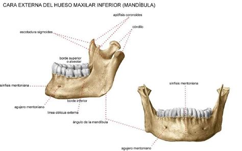 - Cuerpo: Presenta un borde superior o alveolar (reborde alveolar), con orificios por donde nacen las raíces dentarias. En su parte media presenta la sínfisis mentoniana, línea de unión de las dos hemimandíbulas o hemiarcadas, que se osifica en el primer o segundo año de vida. A lo largo de esta línea hay varias crestas de osificación que constituyen la protuberancia mentoniana. A la altura del segundo premolar de cada lado se encuentran los orificios mentonianos, punto de entrada de vasos y nervios. En su cara externa presenta un surco denominado línea oblicua externa.