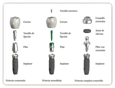 - El pilar: encaja en el implante y pasa a través de la encía, enlazando el implante con la prótesis.