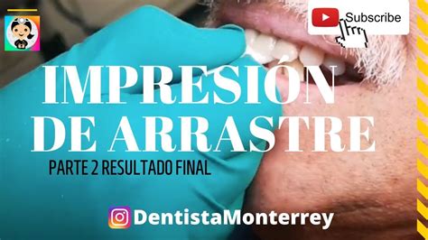 La toma de impresión requiere una cantidad mínima de material para que se puedan reproducir correctamente las arcadas, fondo de vestíbulo, troneras, caras dentales, márgenes gingivales y hasta zonas periodontales. El arrastre consiste en la captura de más de un perfil de impresión, que suele mostrarse como una impresión duplicada y paralela, una cerca de la otra.