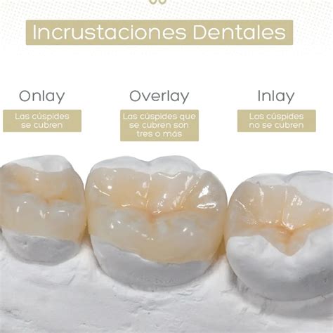 - Onlays: Los onlays, también conocidos como overlays, son similares a los inlays. Su característica diferencial es que cubren una mayor extensión de la superficie del diente, incluyendo una o más cúspides. Los onlays son utilizados cuando la estructura dañada abarca una mayor área del diente. El onlay no solo cubre la superficie interior del diente, sino que también se extiende sobre una o más cúspides dañadas.