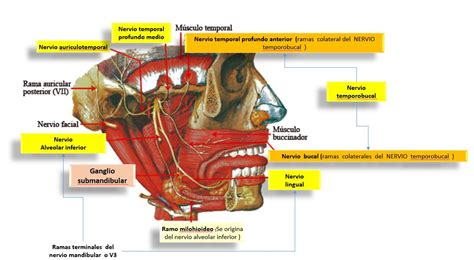 El nervio mandibular se divide en varias ramas que cumplen funciones específicas: