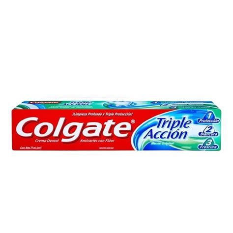 Colgate Triple Acción Pasta Dental es un dentífrico especialmente formulado con flúor que ayuda a mantener tus dientes fuertes y sanos. Su fórmula única ofrece el triple de beneficios en un solo producto, ayudándote a proteger tus dientes contra las caries, manteniéndolos blancos de manera natural y refrescando tu aliento. Contiene fluoruro de sodio y otros ingredientes activos que ayudan a mantener una buena higiene bucal.