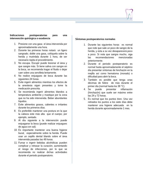 El paciente debe tener en cuenta que el hábito de fumar dificulta el proceso de cicatrización y aumenta el riesgo de infección posoperatoria. Las bebidas alcohólicas también pueden empeorar el proceso de recuperación. Lo más importante es consumir alimentos blandos y a temperatura tibia o fría. Evita los alimentos calientes, duros, crujientes o pegajosos durante por lo menos 3 o 4 días o mientras dure la inflamación.