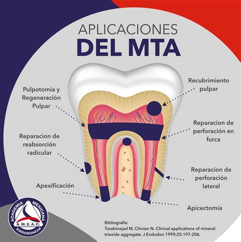 El agregado de trióxido mineral (MTA) es un nuevo material desarrollado para endodoncia. Las principales indicaciones del MTA, son el tratamiento pulpar en dientes vitales (pulpotomias, recubrimiento pulpar directo), apicoformaciones (barrera apical), cirugía endodóncica, reparación de perforaciones furcales, laterales y las provocadas por las reabsorciones. El MTA favorece la formación de hueso y cemento, y puede facilitar la regeneración del ligamento periodontal sin provocar inflamación.