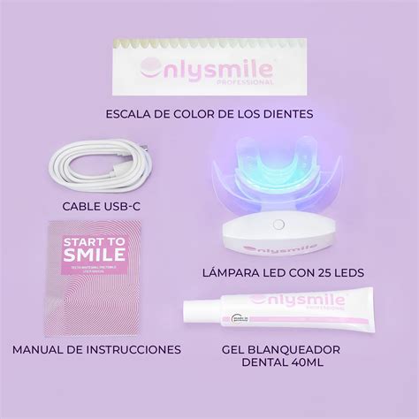 - Kit Blanqueador Dental Activado por Luz: Este kit es cómodo y fácil de usar. Incluye una férula dental fotoluminiscente, un gel dental preparador y otro blanqueador que contiene percarbonato sódico, el cual se activa con la luz de la férula. Tras la primera aplicación, blanquea los dientes un promedio de 5 tonos, y después de 7 aplicaciones consecutivas (una por día), hasta 9 tonos, alcanzando su máxima eficacia. Además, incluye una pasta dentífrica de regalo.