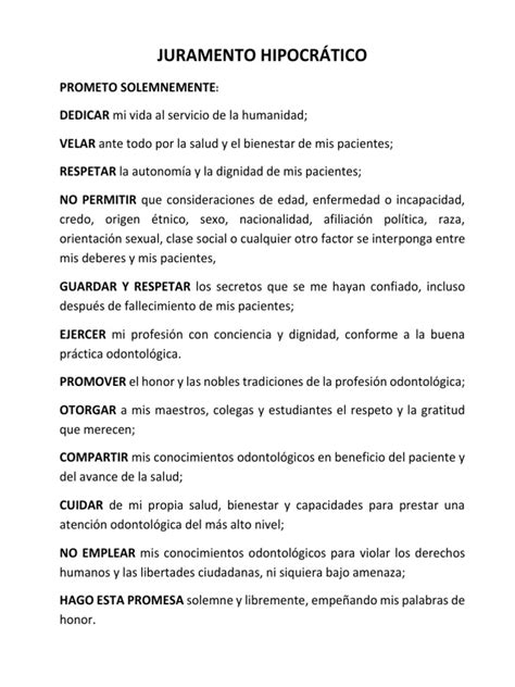 El Juramento Hipocrático moderno en odontología se enfoca en varios aspectos clave. Respetaré todos los avances y ganancias de la ciencia que han alcanzado los dentistas que me han precedido en el camino que ahora empiezo, y también compartiré con mucho gusto los conocimientos que tengo con todos aquellos que me deben seguir. Aplicaré, en beneficio de los pacientes, todas las medidas que sean necesarias, evitando siempre caer en las trampas tanto de tratar en exceso como de abstenerme de tratar si puedo evitar sufrimientos.