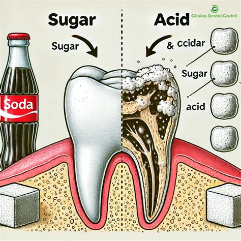 Esto favorece la actividad de las bacterias y facilita la liberación de ácidos que desmineralizan el esmalte y la dentina y conlleva a la aparición de caries. Además de su contenido en azúcar, muchas bebidas azucaradas son también ácidas. Los refrescos y jugos cítricos, por ejemplo, tienen un pH bajo que contribuye a la erosión del esmalte dental. Los niveles elevados de ácido en los alimentos y bebidas cotidianos pueden ser también perjudiciales. Desde las naranjas hasta el vino, los alimentos y bebidas con altos niveles de acidez pueden desgastar tus dientes.